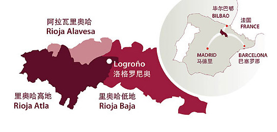 里奥哈葡萄酒产于里奥哈自治区以及相邻的巴斯克地区和纳瓦拉自治区,里奥哈葡萄酒原产地分为三个主要区域,即位于里奥哈地区西北部的上里奥哈(Rioja Alta),阿拉瓦省境内更靠北的阿拉瓦里奥哈(Rioja Alavesa)以及位于里奥哈和纳瓦拉自治区南部的下里奥哈(Rioia Baja).里奥哈葡萄酒产地以北面的坎塔布里亚山脉(Sierra de Cantabria)为屏障,并处在埃布罗河的浸润之下,后者以坎塔布里亚山脉为源头,向东南方向流去,直至注入地中海,流量很小的奥哈河(Rio Oja)在西部一个名为阿洛(Haro)的地点附近流入杜埃罗河,而里奥哈自治区即是因奥哈河而得名的。